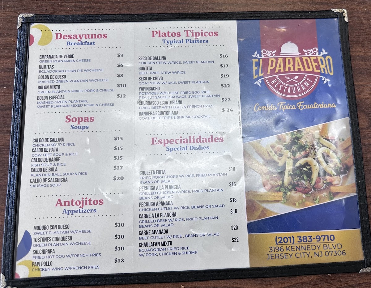 Welcome to El Paradero, a hidden gem in Jersey City offering an authentic taste of Ecuadorian cuisine. Located at 3196 John F. Kennedy Blvd, this vibrant eatery captures the essence of home-cooked flavors, where every dish tells a story. The menu presents an array of delightful options, from refreshing batidos like Quaker Ecuatoriano and Guanabana to hearty sopas, including the Caldo de Gallina and Caldo de Salchicha, perfect for warming the soul.